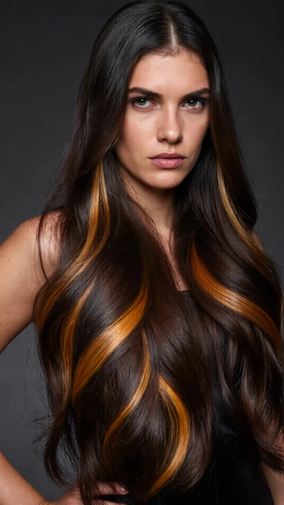If you love contrast, bold caramel streaks can create a high-impact look. This approach is modern and edgy while still being wearable, especially for those who love statement color.