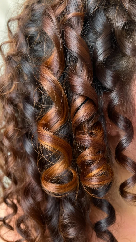 Curls shine with dimension, and caramel balayage enhances every coil. The color placement highlights each curl pattern, creating a gorgeous mix of caramel and brown that’s lively and full of depth.