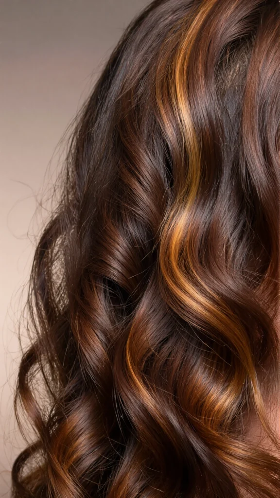 Chocolate brown hair becomes richer and more dimensional when paired with warm caramel ribbons. This combination works beautifully on wavy hair, enhancing definition and bounce.