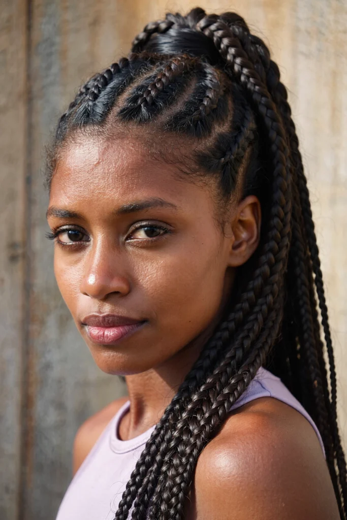 Braids are pulled into a high or low ponytail for a sporty yet stylish look.
