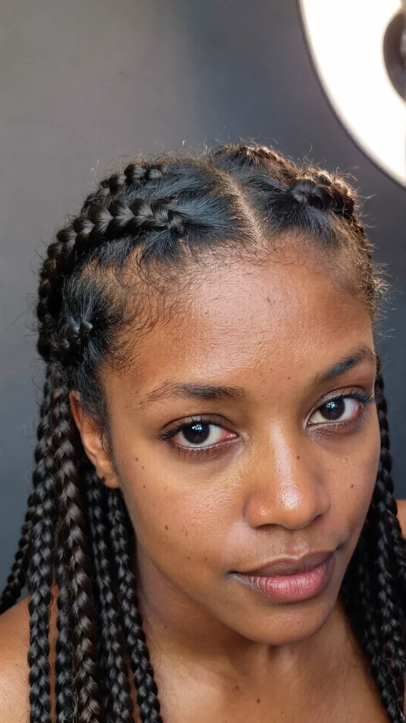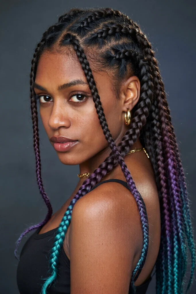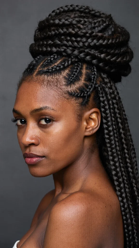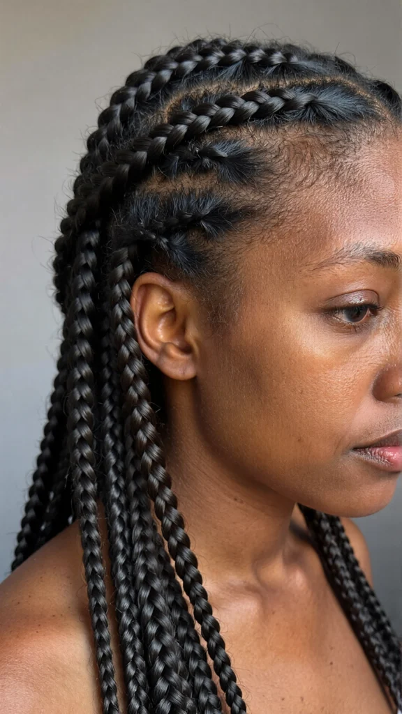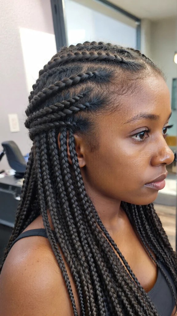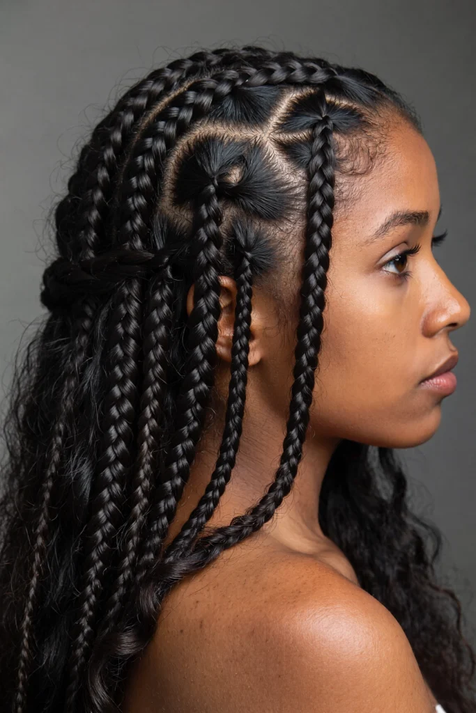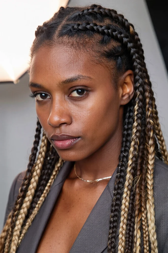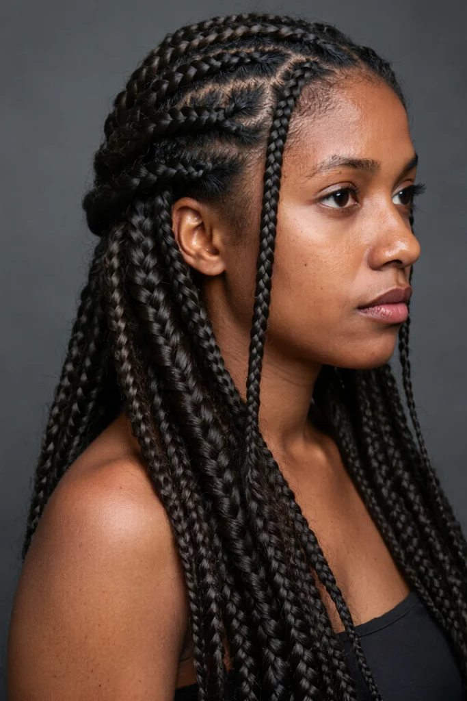 A trendy hybrid style that combines sleek cornrows with free-flowing box braids.