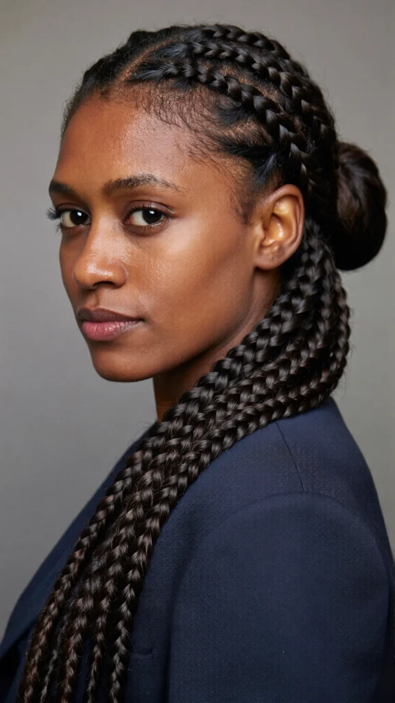 A practical and elegant option where braids are gathered into a bun, perfect for work or formal events.