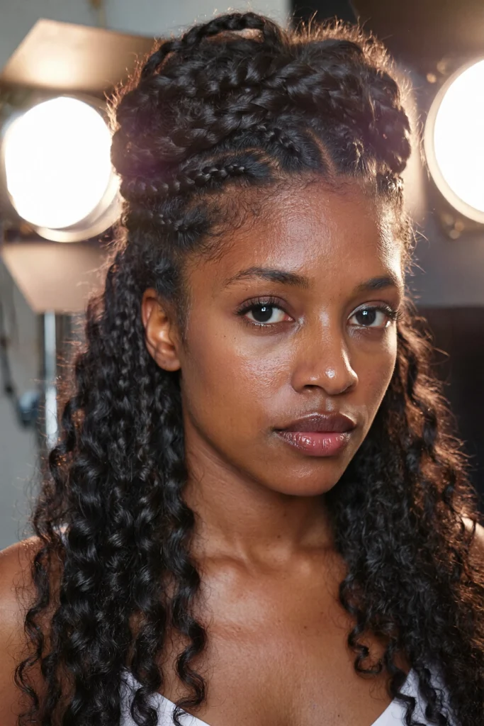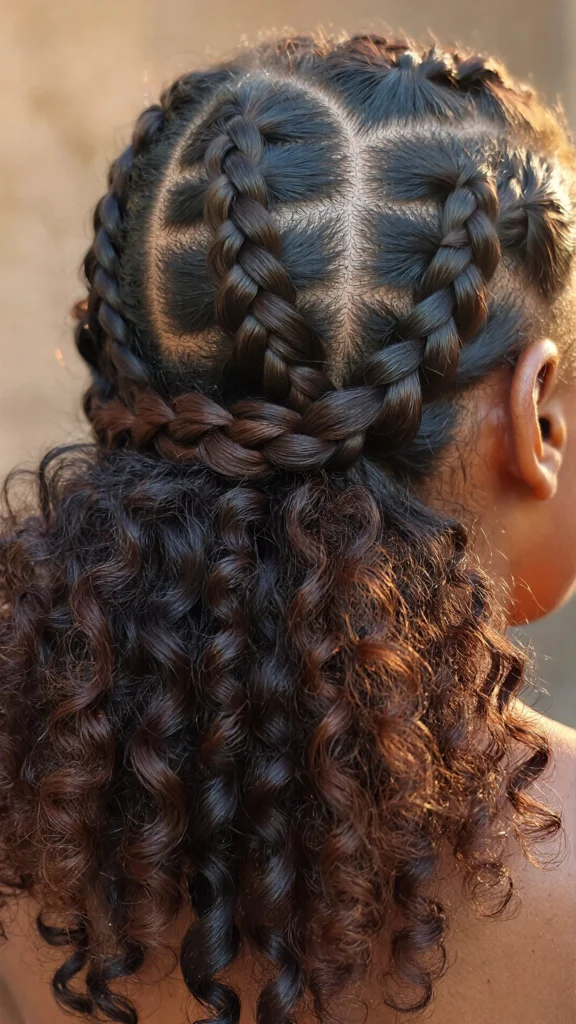 Larger cornrows combined with loose curls create a soft, glamorous look that’s perfect for special occasions.