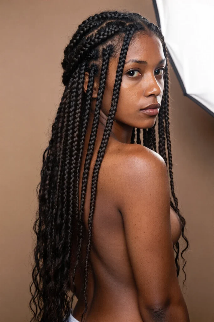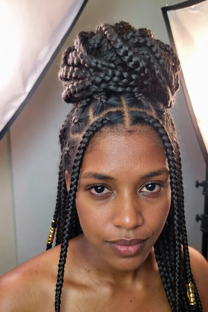Braids are styled into loose curls at the ends, adding softness and femininity to the structured look.