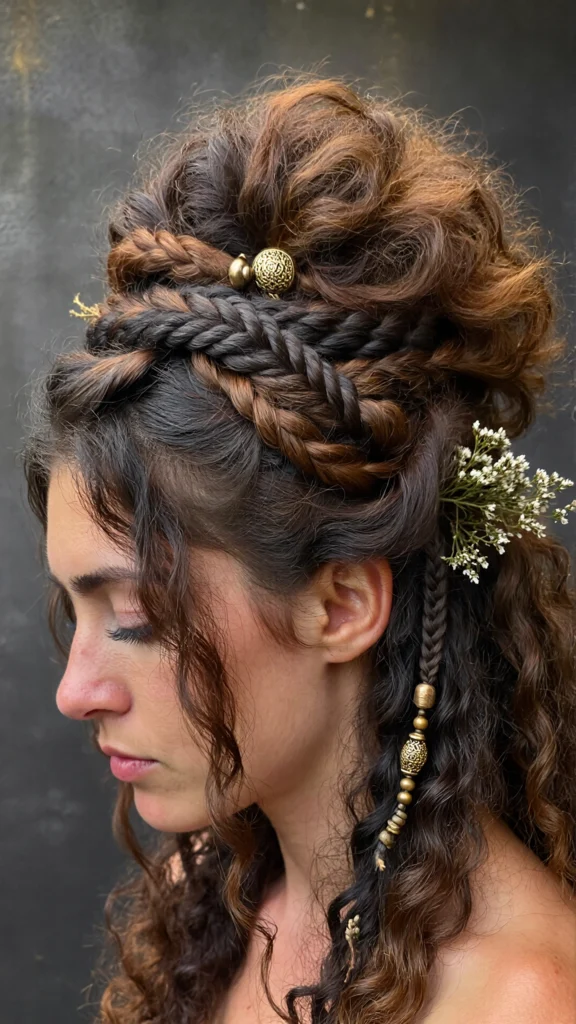 Combines braids with curls for texture and visual interest.