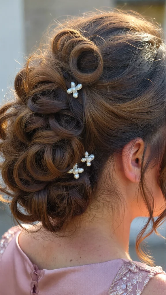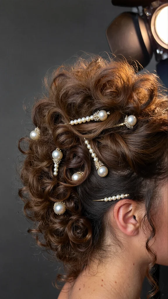 Pearls, clips, or flowers elevate any curly updo.