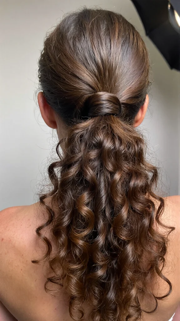 A polished ponytail with curly volume at the back.