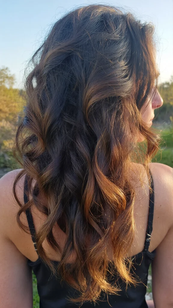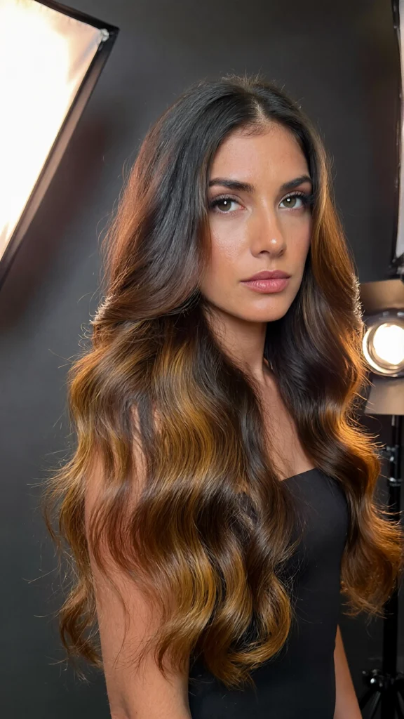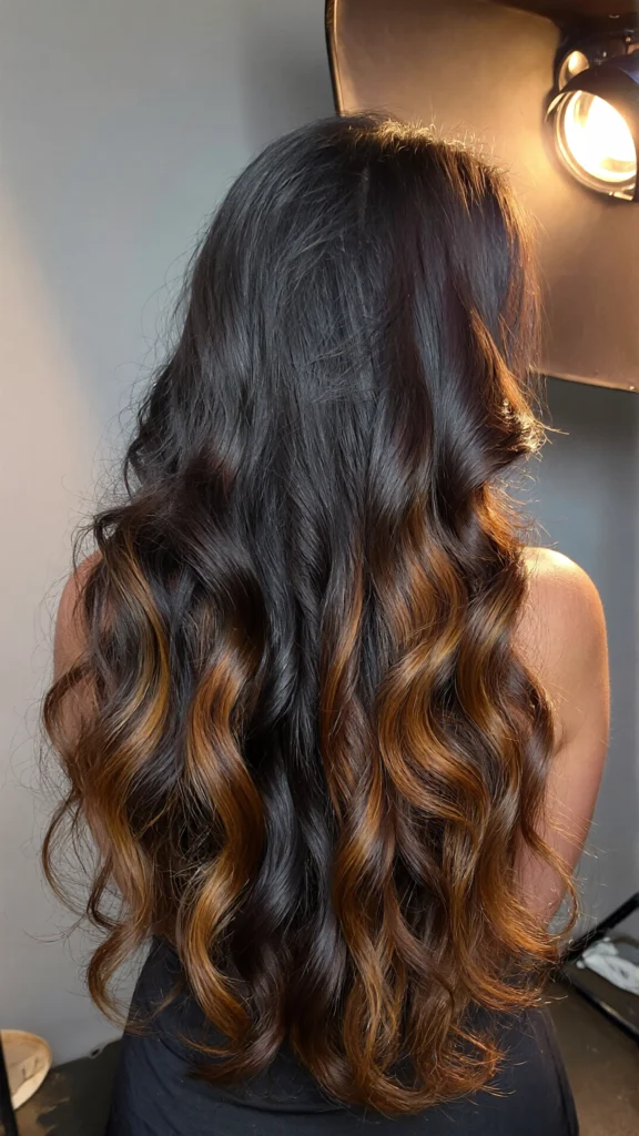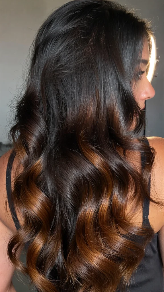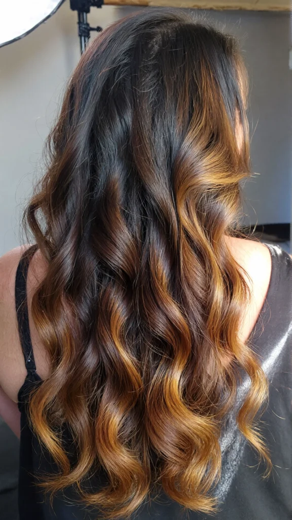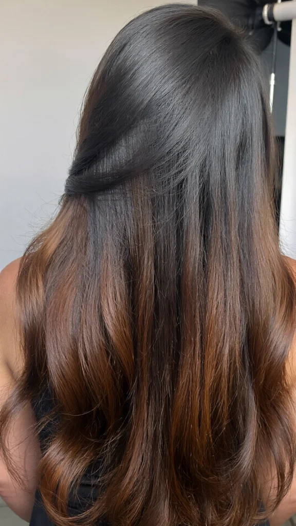 A gradual fade from black roots to golden brown ends for effortless dimension.