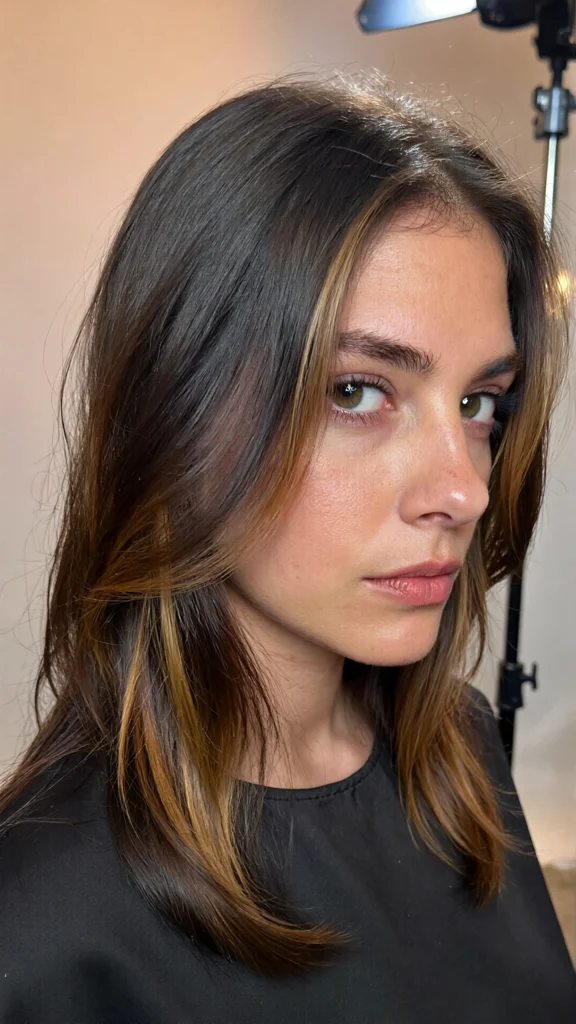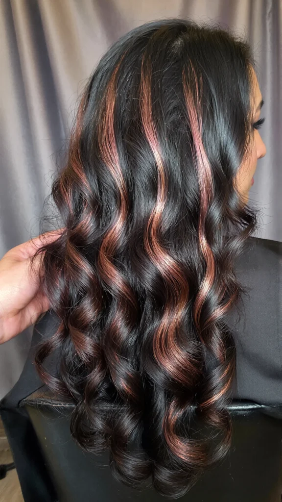 Caramel streaks blended into black hair create a soft, sun-kissed effect.