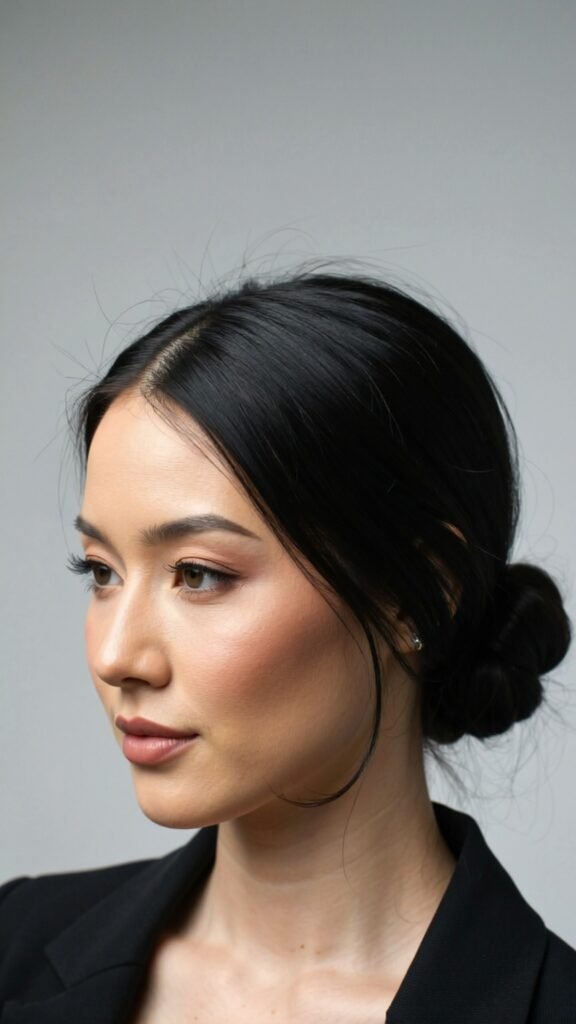 Chic, minimal, and classy, this style pulls hair into a low, neat bun with a clean center part. It’s a favorite for weddings, office days, or any elegant event.