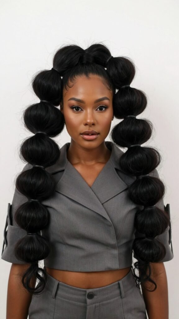 Bubble ponytails are trending everywhere right now. This style involves securing the ponytail with several elastics down its length to create “bubbles.” It’s playful, creative, and works with both natural and straightened hair.