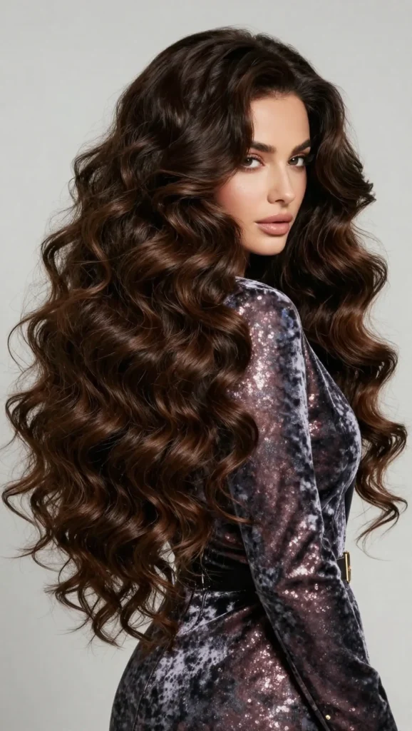 Big, full curls with extra lift at the roots create a dramatic bombshell look, especially on long hair.