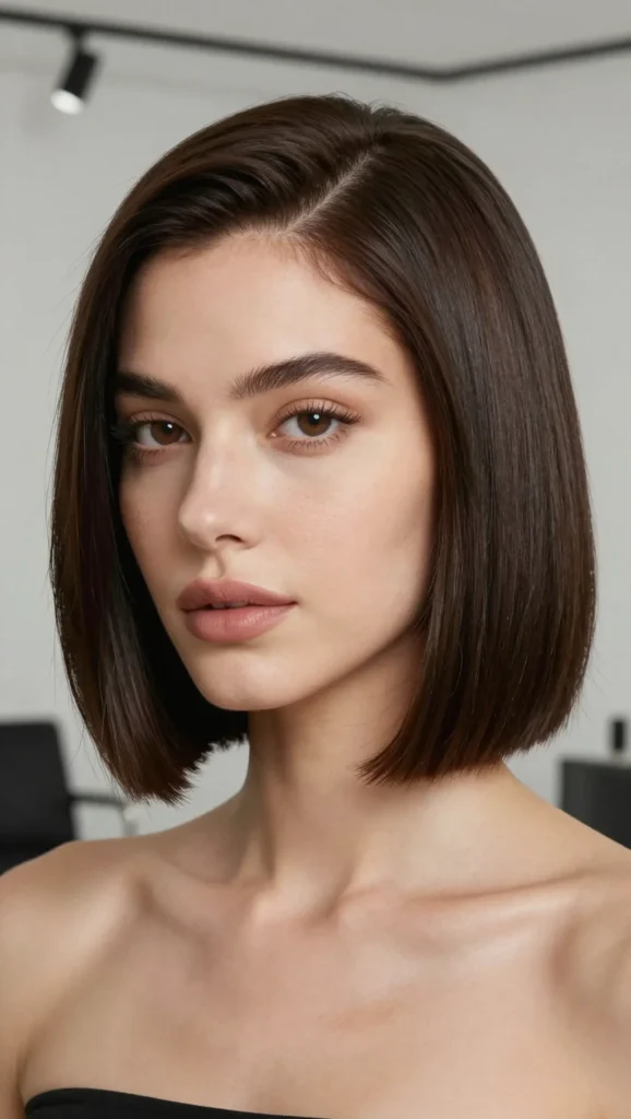 The side part helps balance the sharpness of the blunt line, making the style look softer and more natural.