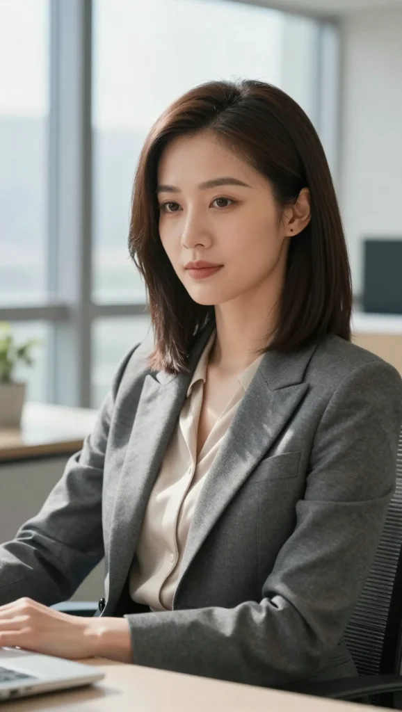 This style is simple, neat, and professional. The hair is usually medium length, lightly layered, and easy to tuck behind the ears.