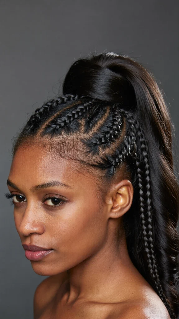 If you want something creative and protective, add small cornrows in the front or sides, then slick the rest into a ponytail.