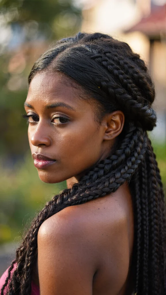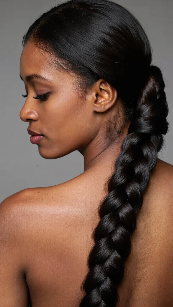 Combine sleek edges with a long braided ponytail for a bold, modern, and protective look. Add hair cuffs or gold strings for extra flair.