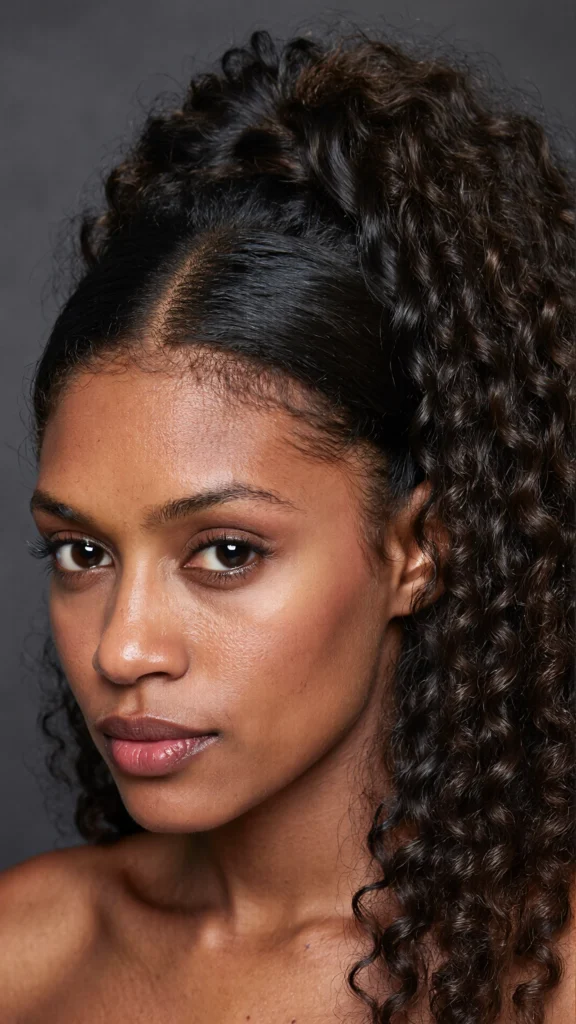 Think Hollywood glam—slick roots but a full, fluffy, oversized ponytail made of curls, waves, or blowout hair.